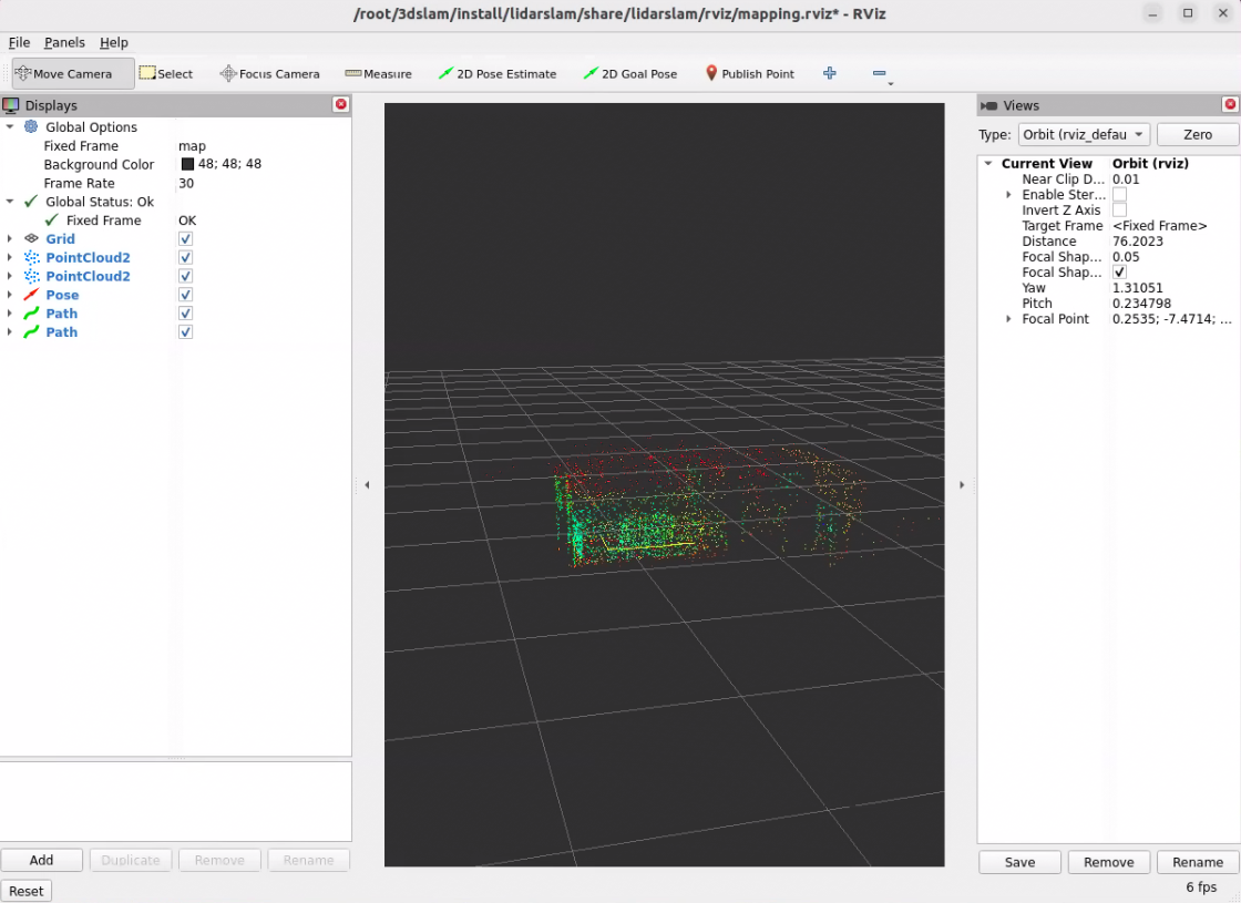 This example already includes a ready-to-use ROS bag file. When the example is executed, the bag is played automatically, allowing you to see lidarslam_ros2 building a 3D map even without any physical hardware.