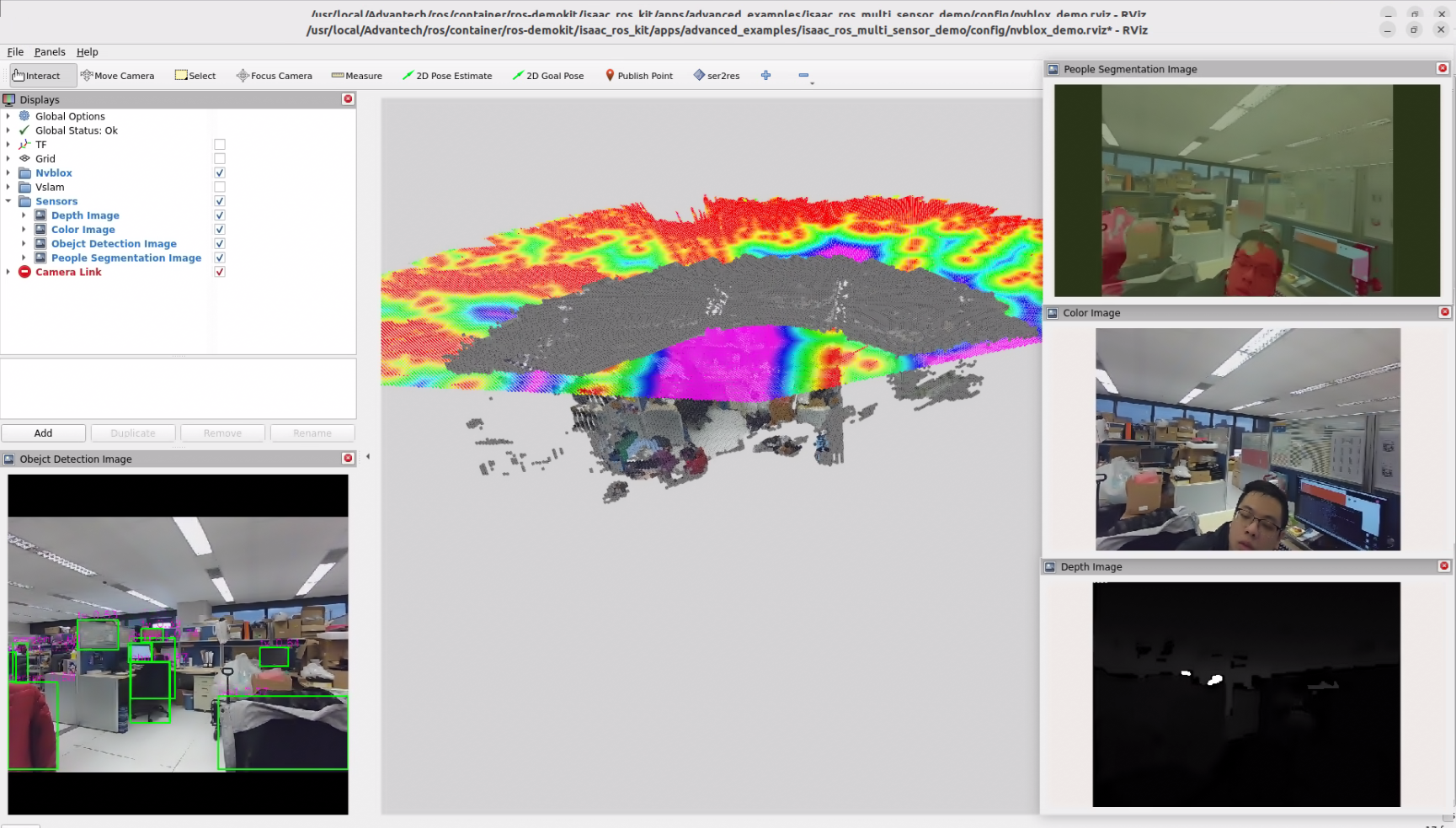 - Watch RViz populate: YOLOv8 detections appear bottom-left, NvBlox in the center, UNet top-right, RGB/Depth streams on the right side.