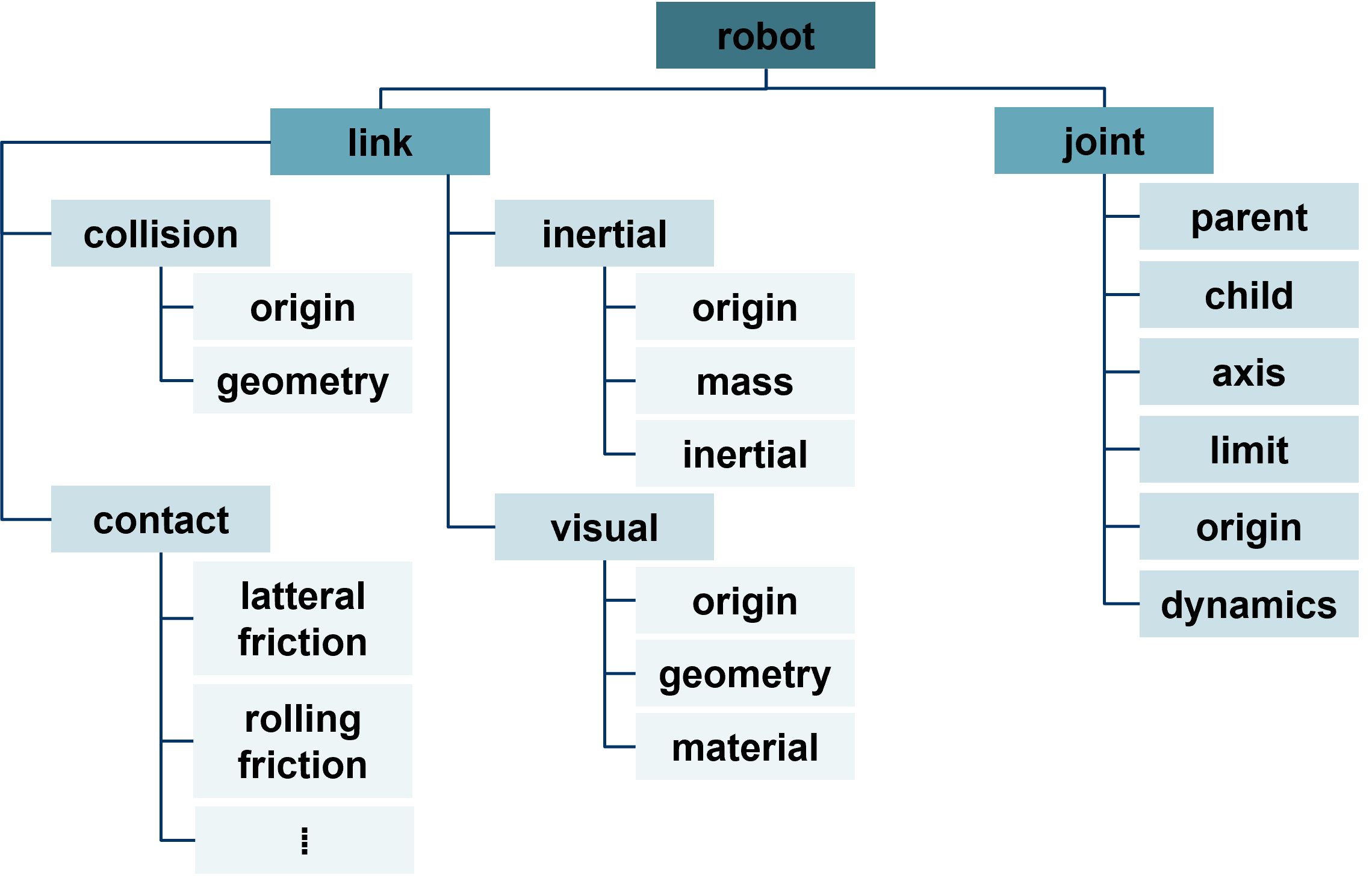 A URDF file is organized under the <robot> tag and includes: