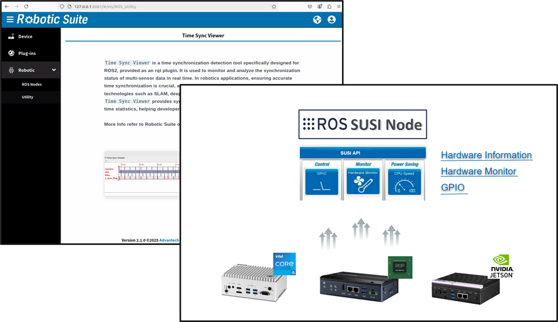 The Advantech Robotic Suite provides add-on services in container such as SUSI, Industry protocols ( Modbus and OPCUA ), ros2 database and DeviceOn ( remote central management )